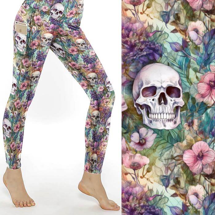 Picture this: a sea of smiling skulls, each one exuding its own charm and personality, set amidst delicate and beautiful pastel blooms. It's a visual paradox that combines the dark allure of skulls with the soft, romantic appeal of florals. These leggings are a masterpiece of duality, where darkness and light dance together in perfect harmony.