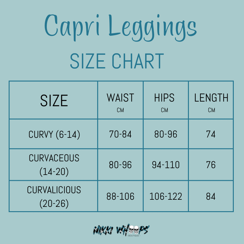 Size chart for capri leggings by Nikki Whoops Boutique