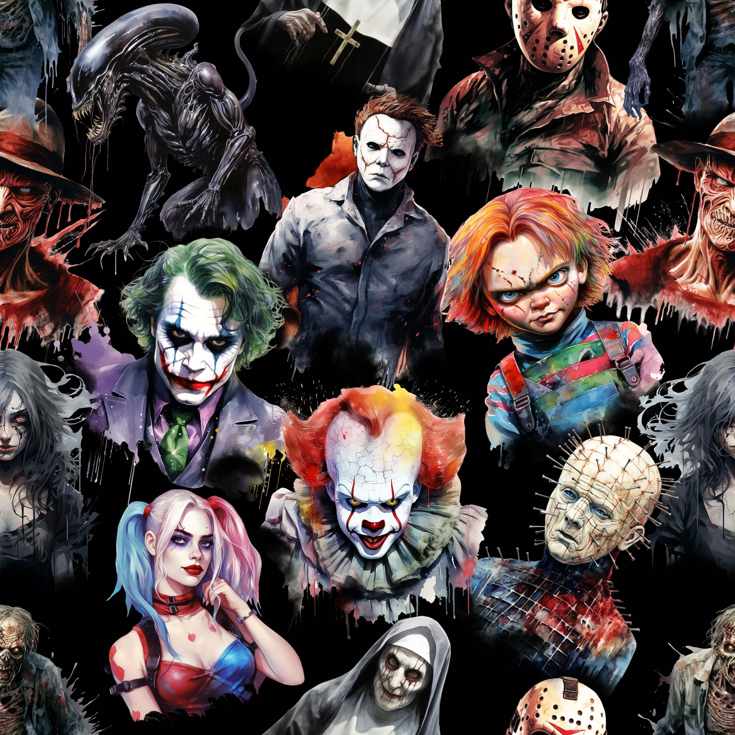 Imagine a dark and brooding landscape, where shadows dance with whispers of malevolence. Here, amidst the gloom, stand the iconic figures of horror and fantasy—Chucky, the possessed doll with a penchant for mayhem; Michael Myers, the silent and relentless shape of fear; Jason Vorhees, the masked avenger of Crystal Lake; The Joker, the chaotic embodiment of anarchy; Freddy Krueger, the nightmare weaver haunting the dreams of Elm Street; Harley Quinn, the whimsical yet deadly accomplice; Samara from The Ring, the vengeful spirit of cursed videotapes; Pinhead, the high priest of pleasure and pain, and many more.